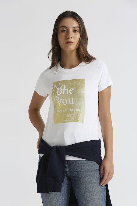 Transform your style with this white t-shirt for women. Made from soft cotton, it provides all-day breathability. The foil print adds a touch of glamour to this casual staple. The round neck ensures versatile wear, while the half sleeves offer breathable movement. A softener wash treatment gives a smooth feel against your skin. Combine this womens t-shirt with high-waisted jeans and wedge heels for a polished yet comfortable look.